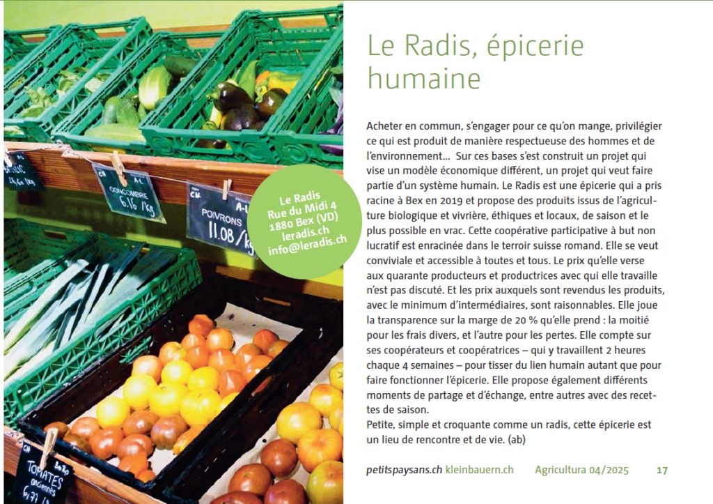 C’est ainsi que l’été dernier, producteurs et consommateurs ont rejoint le Radis, une épicerie coopérative et participative. Ce projet a été initié par Myriam et Thibaud Granges-Nolf. Ils se sont inspirés d’un système similaire à Neuchâtel du nom de Système B. Sur la page d’accueil du site internet du Radis, on découvre cette explication pleine de bon sens quant à l’origine du nom de cette coopérative : « Simple, petit, rond, croquant et rafraîchissant, le radis est le premier légume du printemps. Il accompagne le retour des apéros sur les terrasses ensoleillées et les retrouvailles entre amis. Ce mot, emprunté à l’italien « radice », signifiant la racine, et originaire du latin « radix », se disait « sou » en français au XIXe siècle, ce qui a donné l’expression « j’ai pas un radis sur moi ». À l’image du radis, notre coopérative se veut simple, enracinée dans le terroir suisse romand, populaire, rafraîchissante et conviviale, tout en sachant que l’argent n’est pas au centre de notre démarche. »