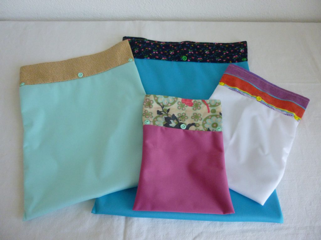 Elles sont fabriquées en PUL et tissu. Le PUL est composé d’un tissu en polyester (labellisé Oekotex-100) recouvert sur un des coté d’une fine couche de plastique (PET recyclé). C’est ce qui rend le tissu imperméable sur une face. Le tout est au bénéfice d’un certificat d’alimentarité pouvant donc entrer en contact avec des aliments.